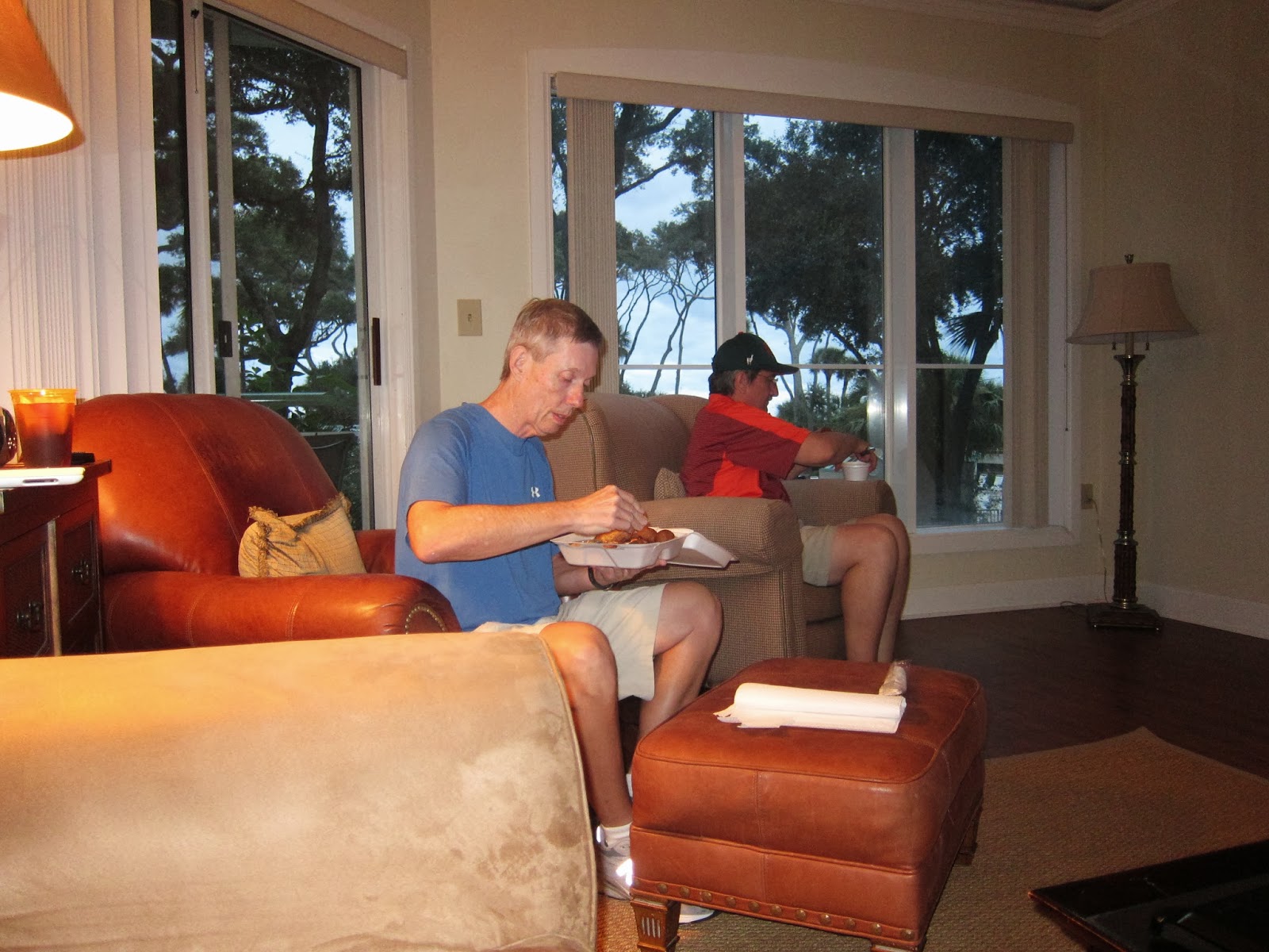 On Saturday night my brother, Charles, joined us. We ordered supper from a local seafood place and Carl and Andrew brought it to our condo so we could eat and watch football.